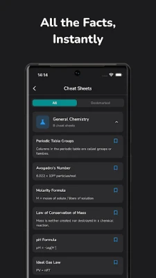 Use the built-in science tools: periodic table, molar masses, element data, electronegativity, and more — even offline.