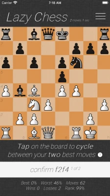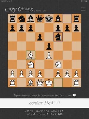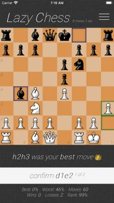 Lazy Chess is a free, non-profit game created for casual players and enthusiasts alike, where players, at worst, make the second best move available to them. On average, there are more than 30 legal chess moves available to a player in a turn, creating vigintillions of possibilities throughout a game. Lazy Chess compresses that by having you choose only two in a given turn selected by Stockfish, the most robust chess engine in the world. The catch? You won’t know which move is the best!